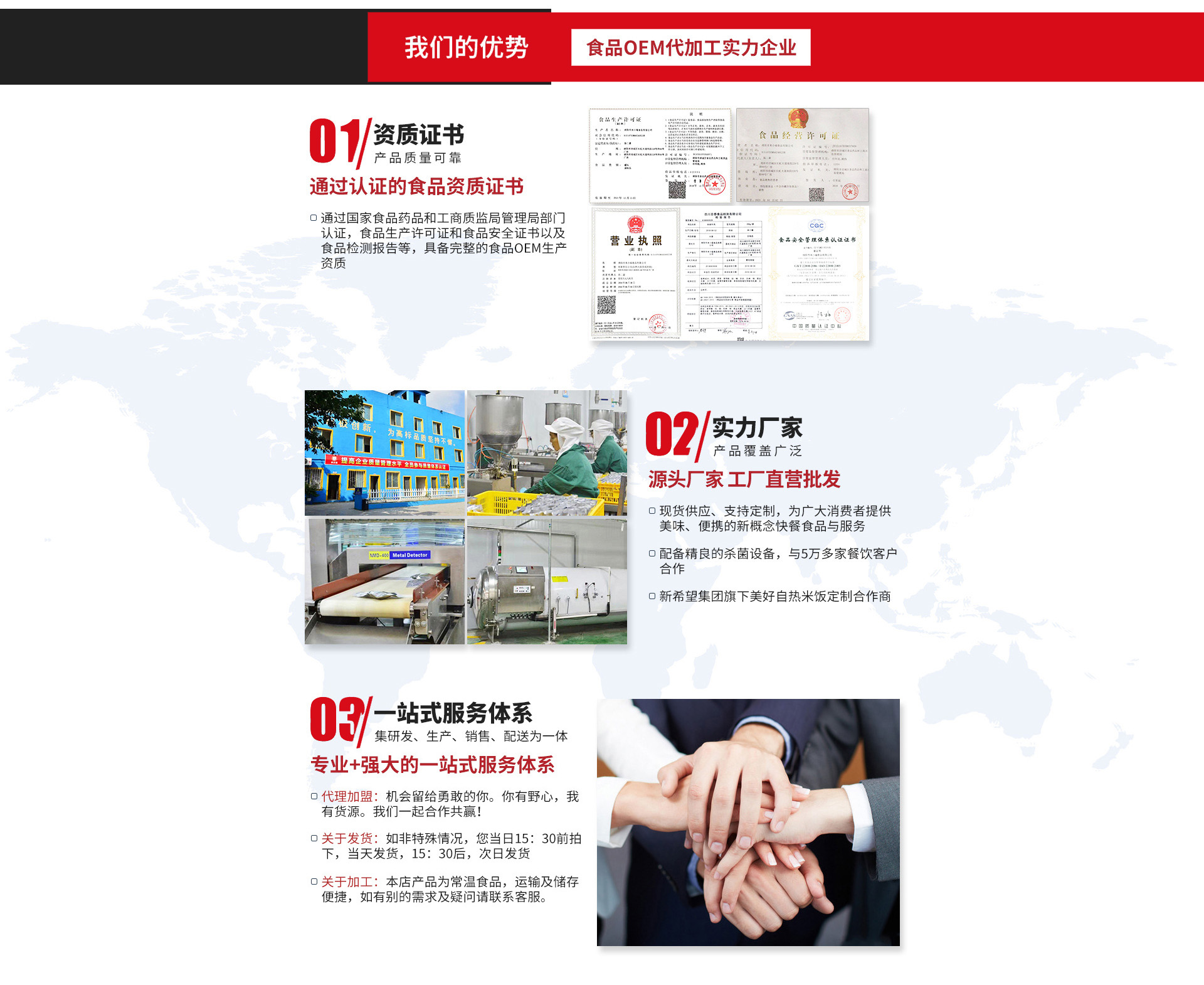 公司生產的主要產品:豬肉類、牛肉類、雞鴨類、湯料類等近30余個品種的方便菜肴料理包